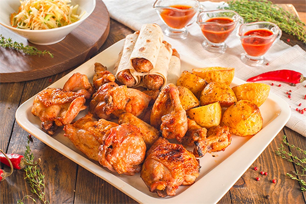 Шашлык из курицы - 250 г., шашлык из куриного бедра - 240 г., острые куриные крылышки - 200 г., люля-кебаб из курицы – 400 г., картофель су-вид - 370 г., салат из капусты, моркови и огурцов – 150 г. Доставляется в фольгированном подносе.