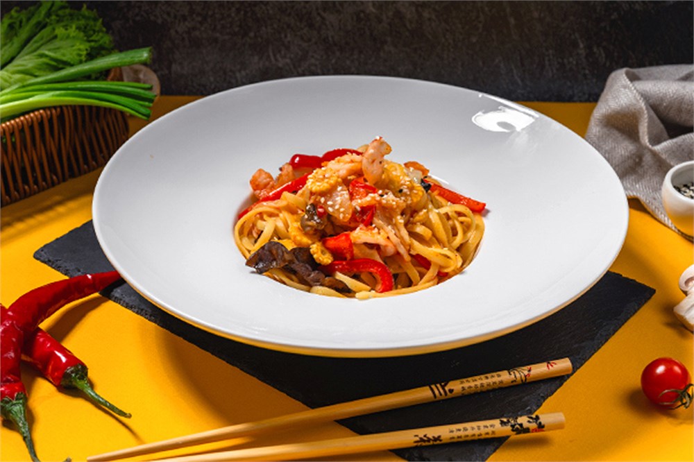 Тигровые креветки, грибы муэр, болгарский перец, красный репчатый лук, пекинская капуста, мини-початки кукурузы, перья зелёного лука, соус камикадзе.